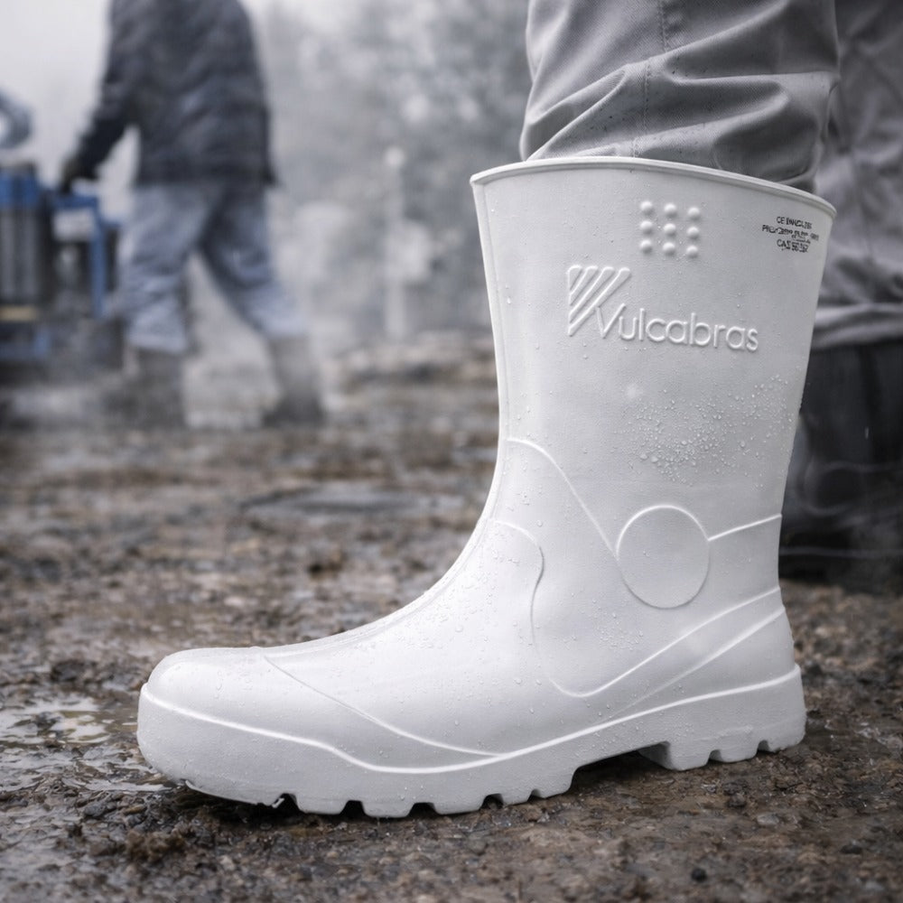 A Bota Full EVA Branca BECC08 Vulcabras é um calçado ocupacional tipo bota de cano curto, impermeável e extremamente leve, ideal para quem trabalha o dia todo em ambientes com umidade constante. Confeccionada em EVA branco, em peça única, ela oferece excelente conforto, isolamento térmico e praticidade para rotinas intensas em setores operacionais.