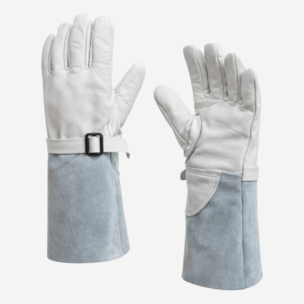 O diferencial técnico está na construção em couro, combinando mão confeccionada em vaqueta com punho em raspa. Essa composição equilibra resistência e funcionalidade: a vaqueta cobre palma, dedos e dorso para suportar atrito e manuseio, enquanto o punho em raspa reforça a região do punho e contribui para proteção adicional. Para aumentar a durabilidade nos pontos críticos de esforço, há tira de reforço em vaqueta entre o polegar e o indicador e protetor de artéria em vaqueta, além de uma tira na altura do punho. O ajuste é feito com fivela plástica, ajudando a manter a luva firme durante movimentação, troca de postura e trabalho contínuo — um detalhe que faz diferença quando a luva precisa ficar estável sobre a luva isolante, sem folgas que atrapalhem o controle da pegada.